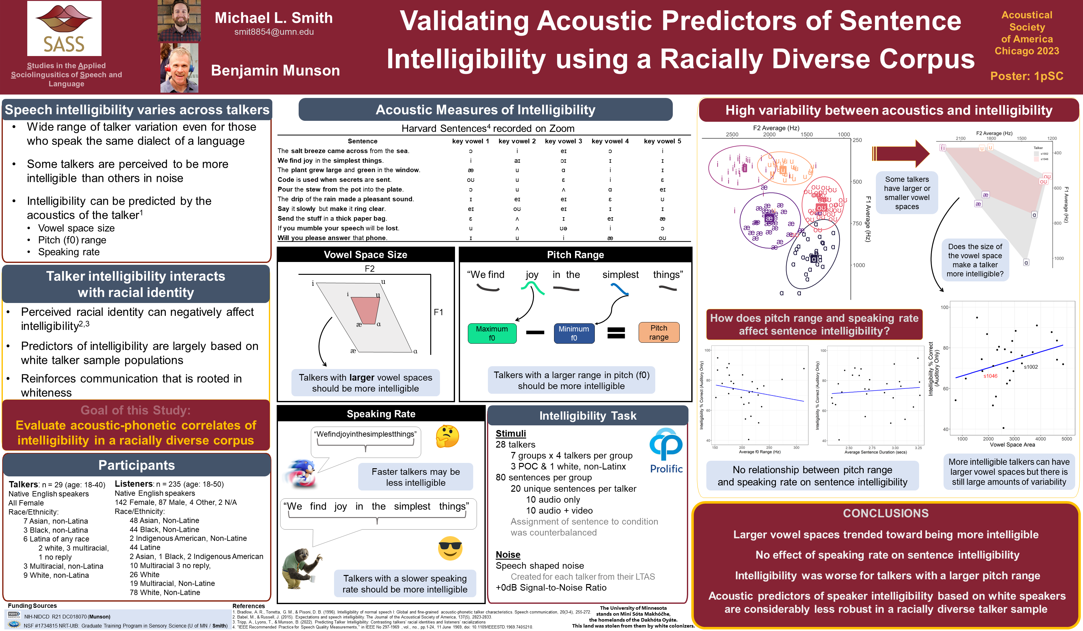 The goal of the present work is to validate a set of widely used acoustic measures that have been found to predict talker intelligibility using a new, racially diverse corpus of native speakers of American English. Previous work has found changes in F0 and larger vowel spaces to be associated with higher sentence intelligibility. Here, we examine whether these same acoustic features can be generalized to a more racially diverse population of talkers. A poster with the current update to this project is shown below and can be downloaded here.