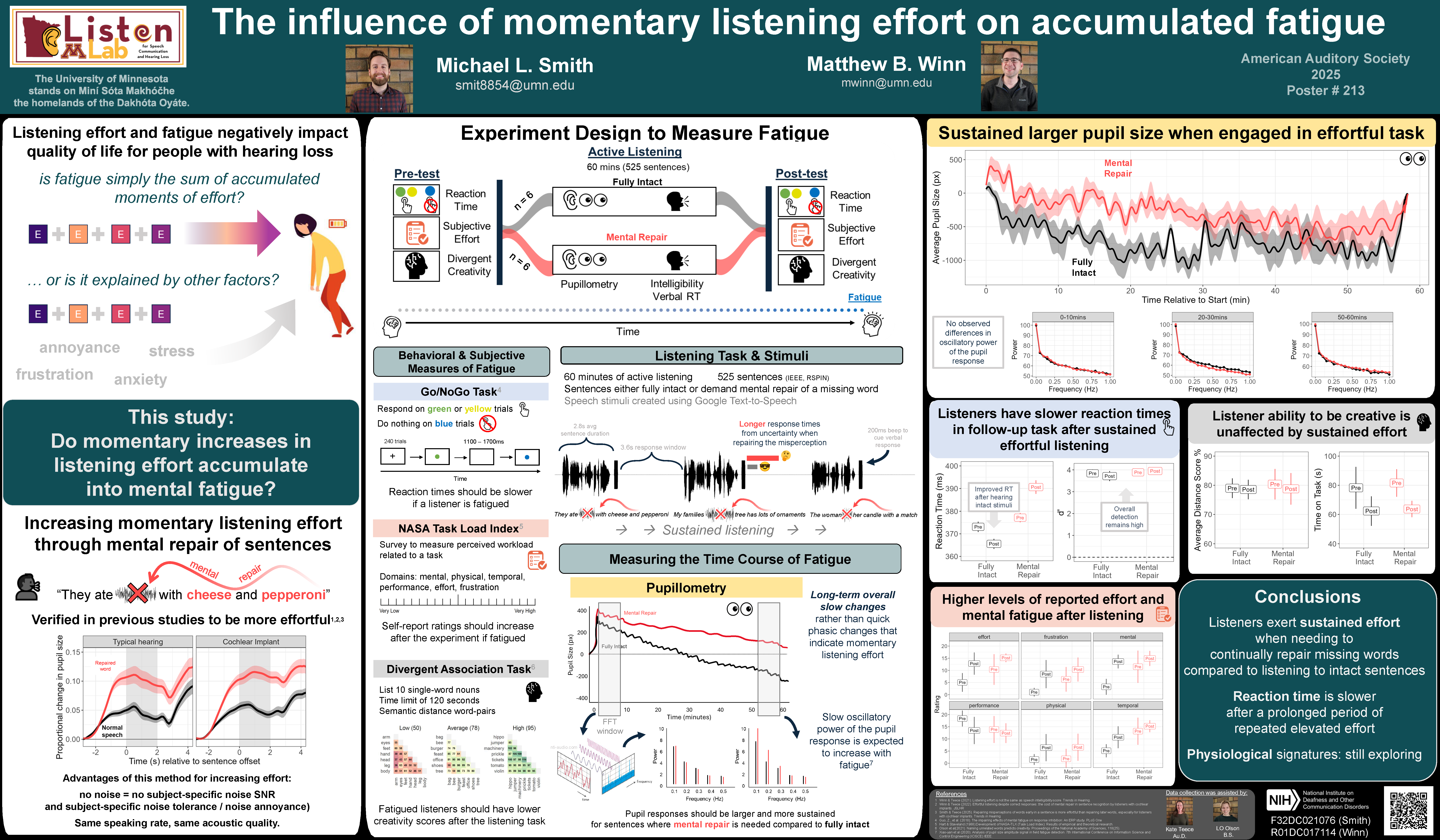 Aim 2 is focused on understanding if momentary increases in listening effort directly accumulate into mental fatigue or if listening fatigue is explained by other factors. A poster with the current update to this project was presented at the 2025 American Auditory Society (AAS) meeting and is shown below. It can also be downloaded here