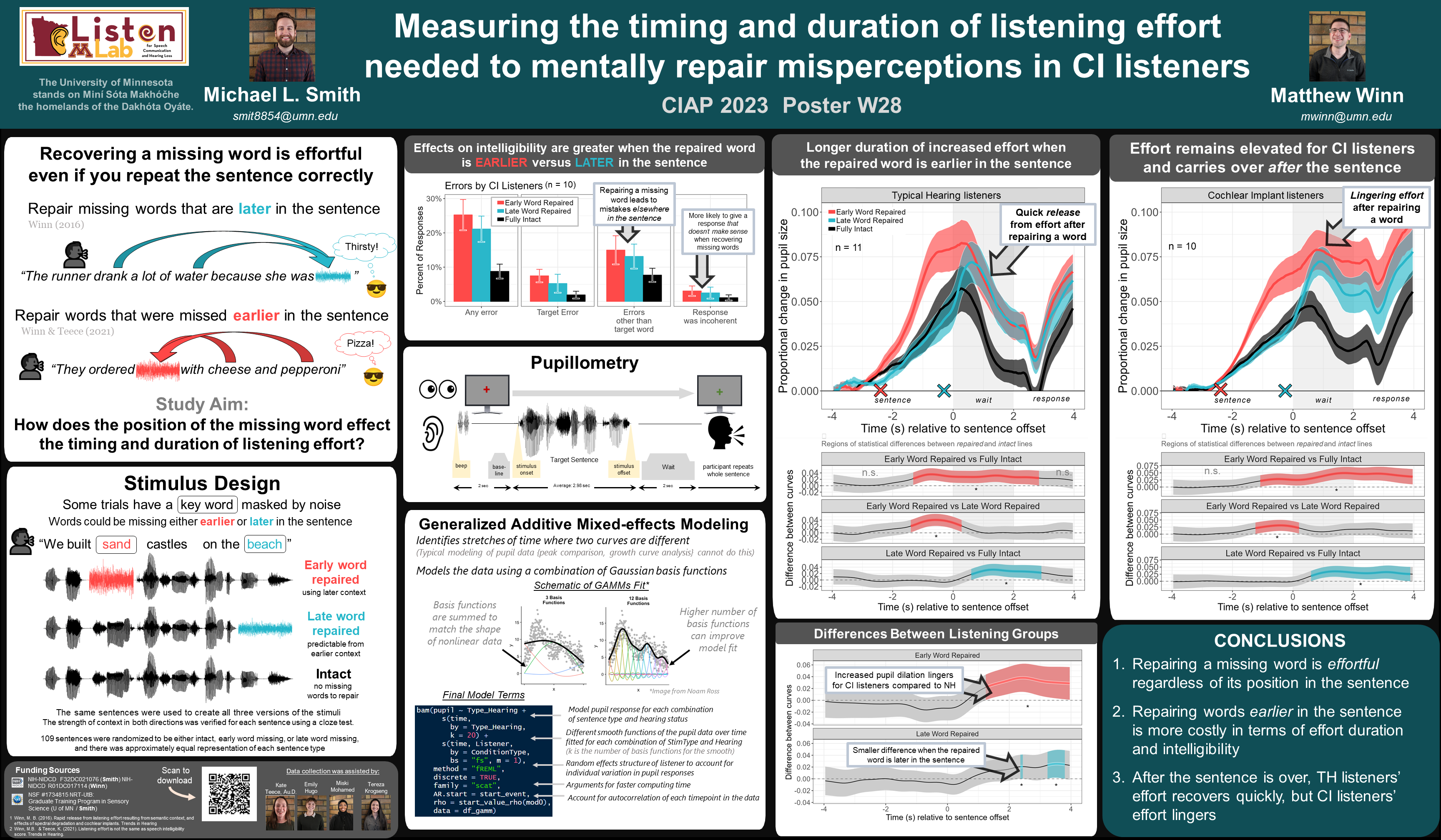 Aim 1 of my F32 award focuses on understanding how listeners with and without hearing impairment use speech context to repair a misperception, and how this process affects the timing and duration of listening effort. This work is in press at Trends in Hearing (doi: 10.1177/23312165251320789) and will be made available soon. A poster presented at CIAP in 2023 is shown below and can be downloaded here.